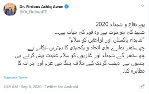 شہید کی جو موت ہے وہ قوم کی حیات ہے۔۔۔ “شہداء پاکستان اور لواحقین کو سلام” چھ ستمبر ہمارے ملی اتحاد و یکجہتی کا بہترین عکاس ہے۔ چھ ستمبر کے شہداء اور غازیوں کو سلام عقیدت پیش کرتے ہیں جنہوں نے دہشت گردی کے خلاف جنگ میں عزم اور جرات کا مظاہرہ کیا۔