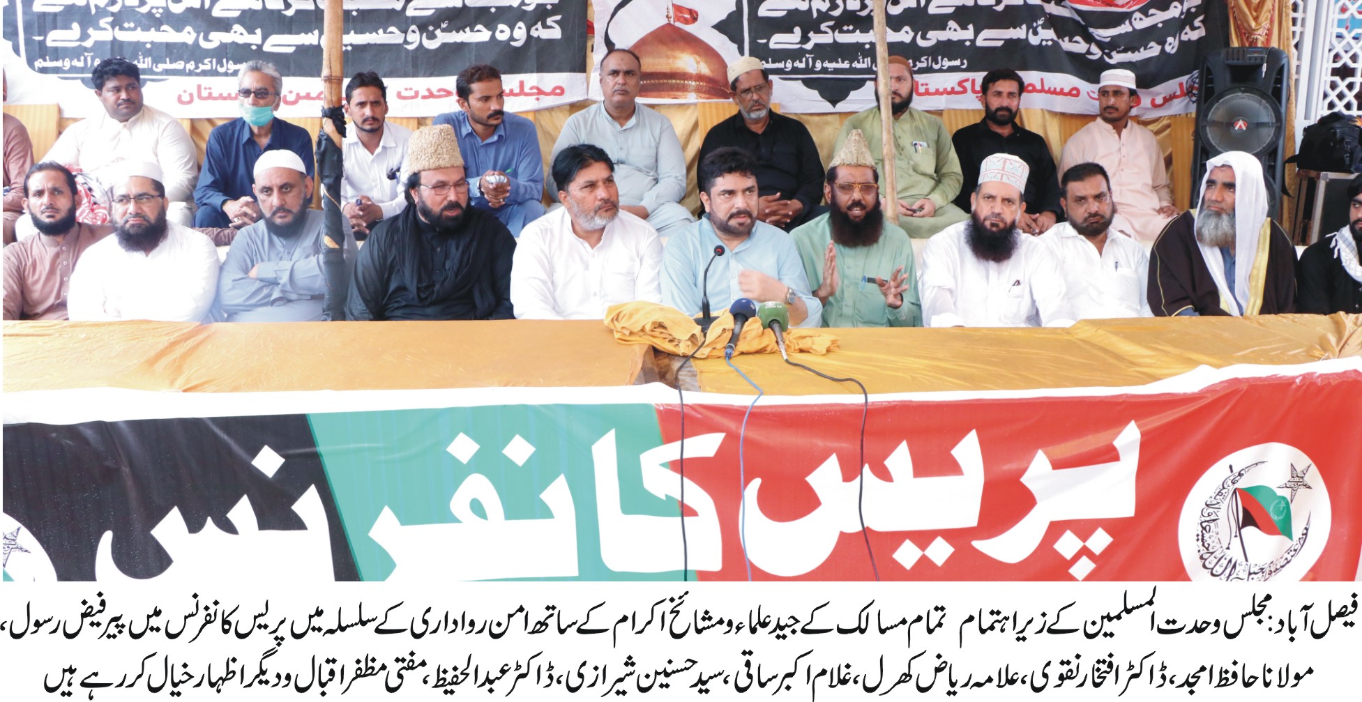 مولانا حافظ امجد، ڈاکٹر افتخار نقوی، علامہ ریاض کھرل، غلام اکبر ساقی، سید حسنین شیرازی، ڈاکٹر عبد الحفیظ، مفتی مظفر اقبال ودیگر مولانا محمد یوسف انور، ذاکر حسین نقوی، ڈاکٹر ممتاز حسین، ودیگر موجود ہیں ۔مجلس وحدت المسلمین کے احداف میں اتحاد بین المسلمین کو بنیادی حیثیت حاصل ہے اور آج تمام احباب نے یہاں تشریف لاکر ہماری حوصلہ افزائی کی ہے اور ہمیں مزید آگے بڑھنے کے لیئے اعتماد دیا ہم اس بات سے بخوبی آگاہ ہیں کہ ہر مسلک کے نظریات کا احترام ہی وحدت کی لڑی ہے۔ہم تمام مسالک سے اپیل کرتے ہیں کہ اپنے اپنے پلیٹ فارم اور اسٹیج سے اختلافی باتیں بھلا کر امن پیار محبت کا درس دیں اور اپنے مسلک کو چھوڑیں نہ اور دوسرے کے مسلک کو چھیڑیں نہ ۔ہم پاکستان کے اسرائیل کو تسلیم نہ کرنے کے اعادہ پر وزیر اعظم عمران خان کے شکر گزار ہیں اور آرمی چیف قمر جاوید باجوہ کی کوشوں کو بھی سراہتے ہیں اور محرم الحرام کے اس مہینہ کی برکت سے ہم انشاء اللہ وحدت امت کے لئے اپنا کردار ادا کرتے رہیں گے آخر میںمیں تہہ دل سے میڈیا اور مہمان نان گرامی اور شراکاء کا بے حد ممنون ہوں۔ میں تمام ڈویژن و ڈسٹرکٹ انتظامیہ کا مشکور ہوں خاص طور پر کمشنر عشرت حسین ،آر پی او راجہ رفعت اقبال، ڈپٹی کمشنر محمد علی، سی پی او سہیل وہدری، کارپوریشن اور واسا کے احباب ،سکیورٹی ایجنسیز ،افواج پاکستان ،حکومتی ارکان ممبران اسمبلی شکیل شاہد ،راجہ ریاض اور فیض اللہ کموکا کا بے حد مشکور ہوں کہ ان کے تعاون سے ایام محرم الحرام کی عبادات پر امن پر سکون ماحول میں انجام پا رہے ہیںآخر میں تمام مسالک کے جید علما نے ہاتھوں میں ہاتھ ڈال کر اظہار یکجہتی کیا