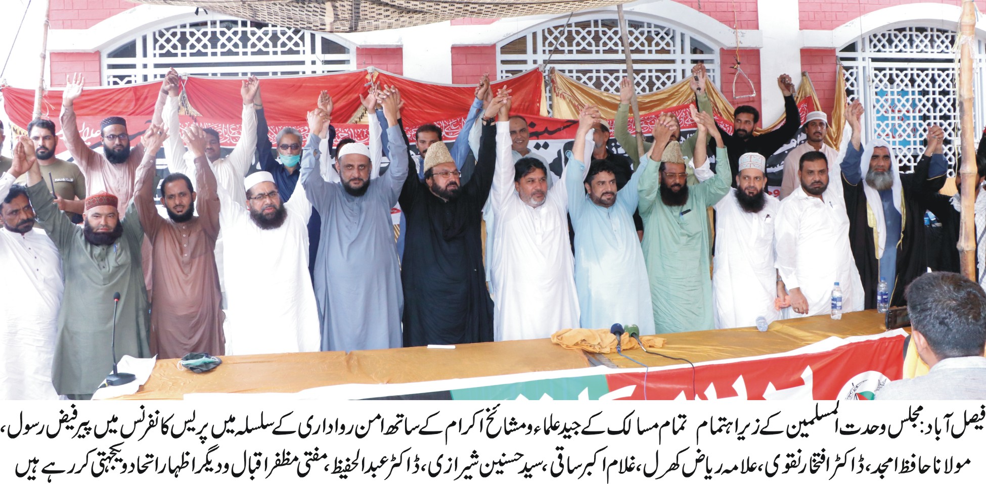 فیصل آباد: محترم صحافی برادران آج جو کوگ مقصد امام حسین علیہ السلام جو کہ امن و بھائی ارہ محبت اور دین کی سر بلندی کا پیغام دیتا ہے کو عام کر رہے ہیں یقینا وہ لوگ کارزے نبی ادا کر رہے ہیں اس قافلہ میں مختلف مسالک کے جید علما اکرام زعما اور مشائخ اپنا کردار ادا کر رہے ہیں ۔اور آج اس پریس کانفرنس میں تمام مسالک کے جید علما اکرام اور مشائخ تشریف فرما ہیں جن میں پیر فیض رسول،